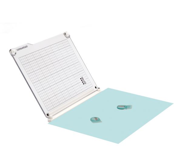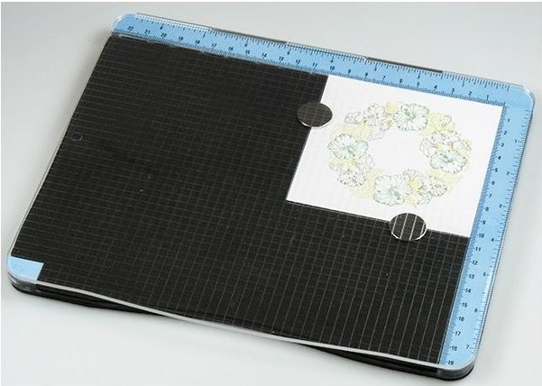 Il vous faut d’abord positionner votre papier sur le support horizontal de la presse de précision, en utilisant les blocs magnétiques pour que votre papier ne bouge pas.