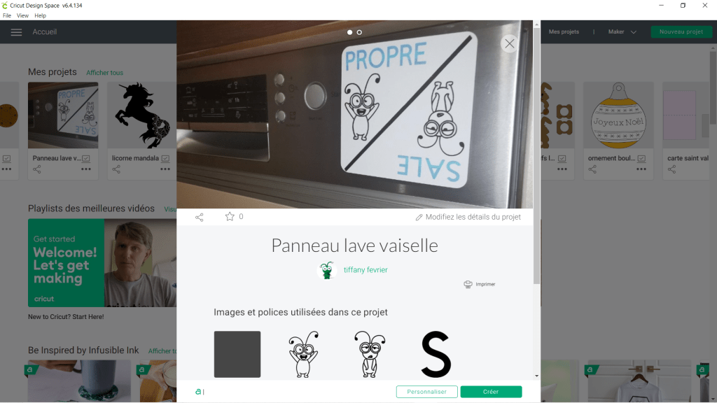 Sur Design Space, ouvrez le projet « Panneau lave-vaisselle » (ici). Comme nous n’allons pas apporter de modifications à ce projet, cliquez directement sur Créer.