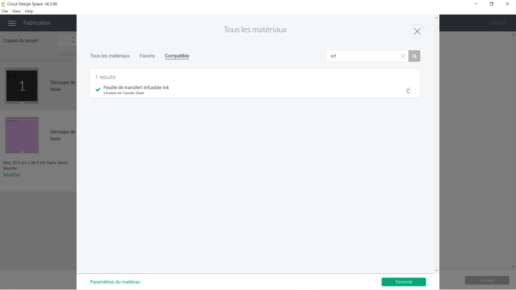 Sélectionnez le matériau « Feuille de transfert Infusible Ink »