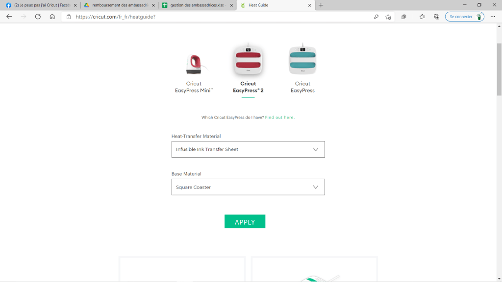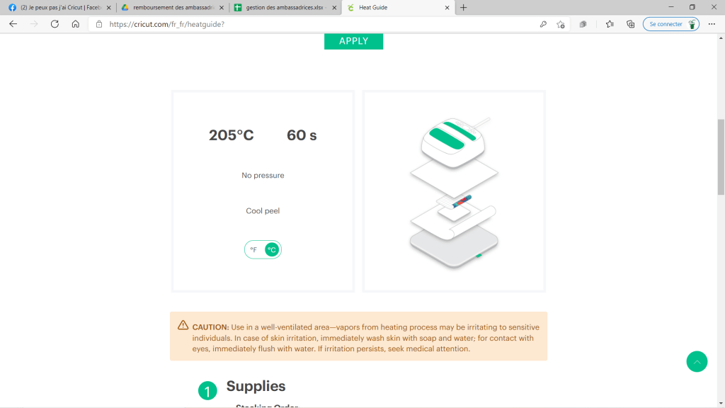 Pour connaitre les paramètres de chauffe, vous pouvez vous rendre sur le guide de chaleur Heat Guide (ici). Sélectionnez « Infusible Ink transfer sheet » dans la rubrique matériau et « Square Coaster » pour le support. Faites « Appliquer ». Par défaut, le résultat est mentionné en Fahrenheit, demandez une conversion en Celsius.