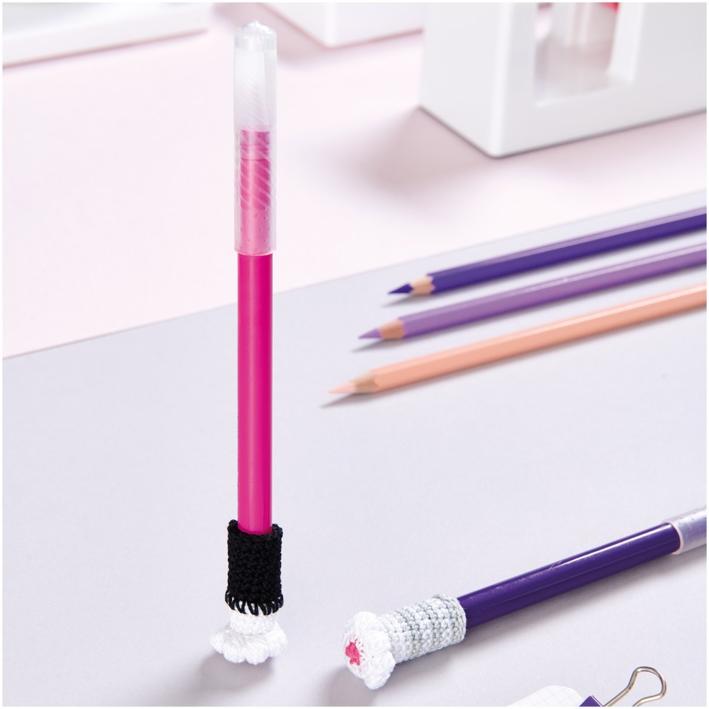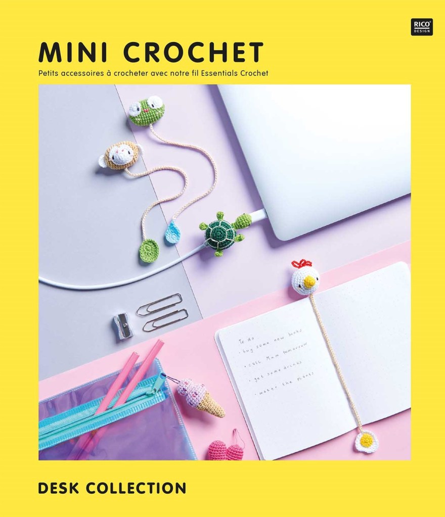 Ces mini accessoires de bureau sont réalisés au crochet et expliqués en détail dans le livre Mini Crochet Desk Collection de la marque Rico Design
