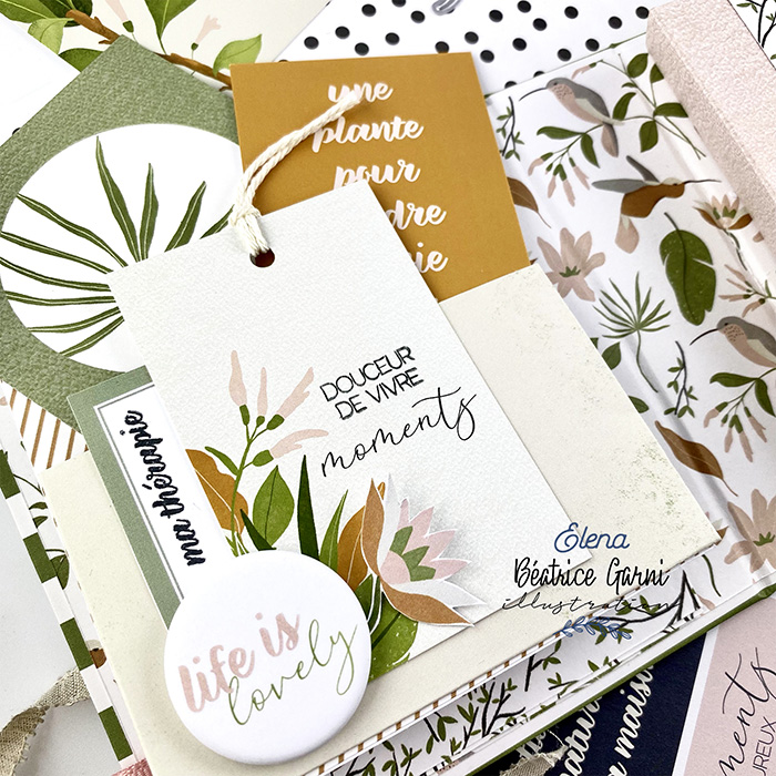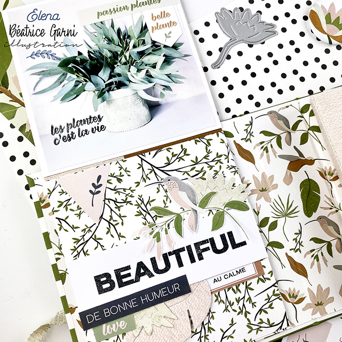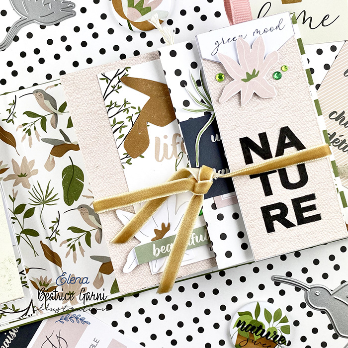 Elena La Scrapperia a réalisé un album Nature composé de rabats, de pochettes, avec de jolis détails et des superpositions