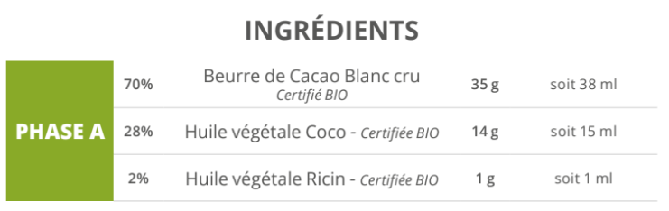 beurre de Cacao, huile de Ricin et huile de Coco, ce démaquillant