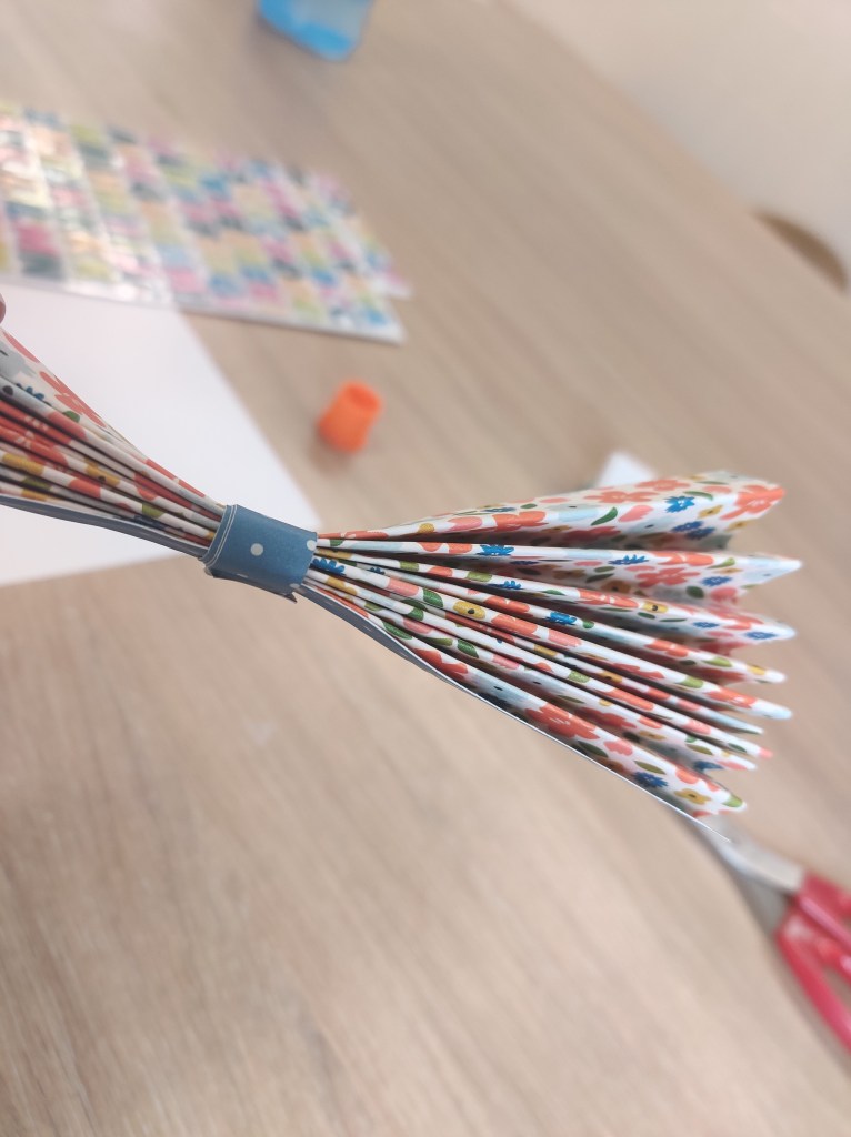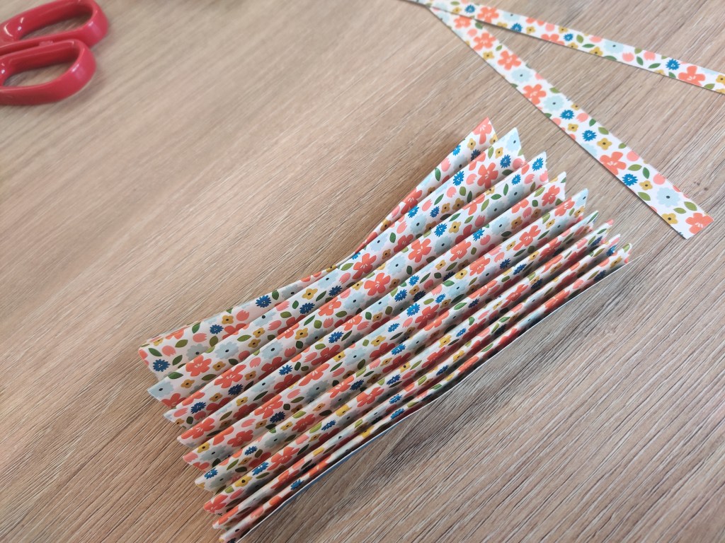 Dans un premier temps, découper une bandelette dans votre papier coloré (voir photo ci-dessus)