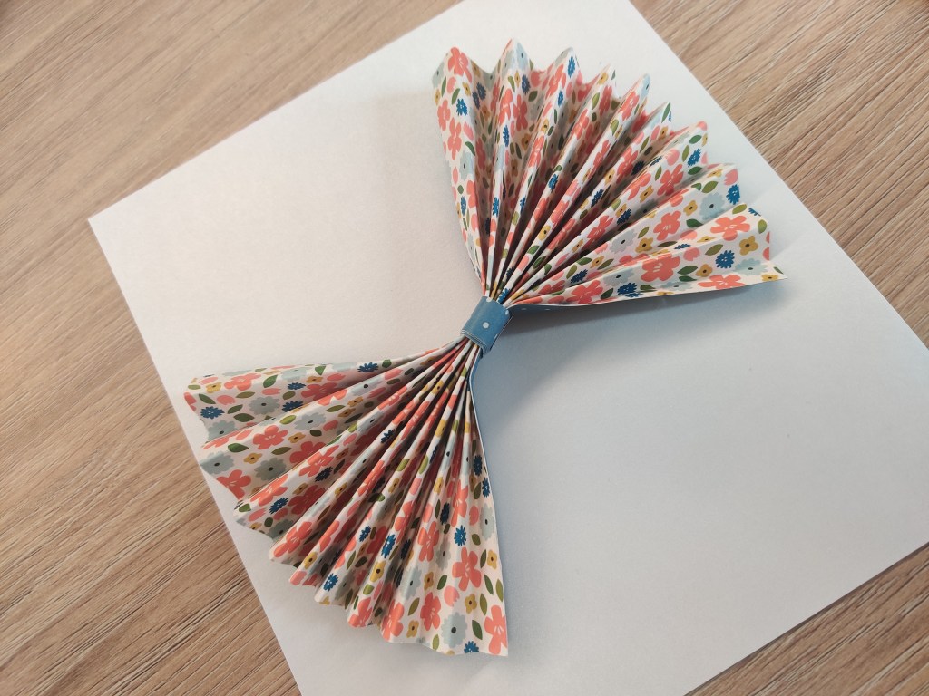 Placer la bandelette de papier au centre du nœud, l’enrouler et la coller