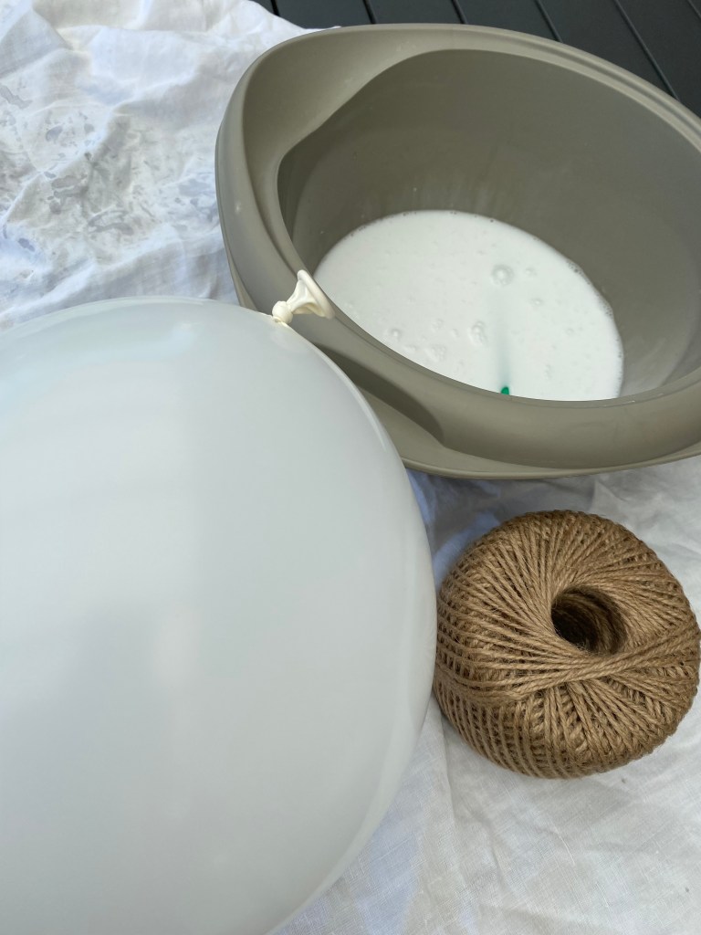 Vous devez mettre la ficelle dans la colle liquide et retirer l’excédent de colle avec vos doigts pour ensuite enrouler comme vous le souhaitez la ficelle autour du ballon (voir les photos ci-dessus et ci-dessous)
