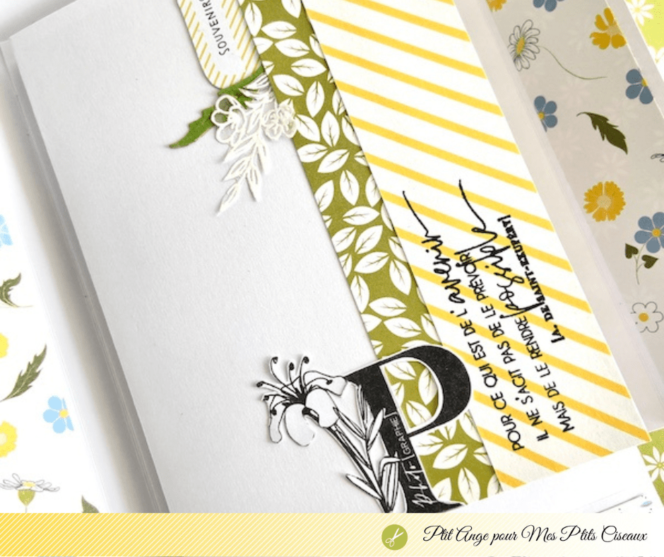 La collection de papiers est composée de 6 feuilles imprimées recto-verso accompagnées de 4 mini-tags. Elle est complétée par 3 sets de dies, 2 planches de tampons A6, un set de die-cuts ainsi qu’une planche d’étiquettes à découper.