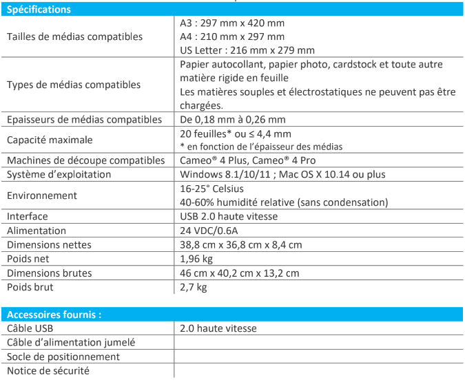 Le chargeur automatique SHEET-FEEDER-A3+ est compatible avec la Silhouette CAMEO PLUS et la Silhouette CAMEO PRO uniquement (nécessite le Silhouette Studio Business Edition vendue séparément)