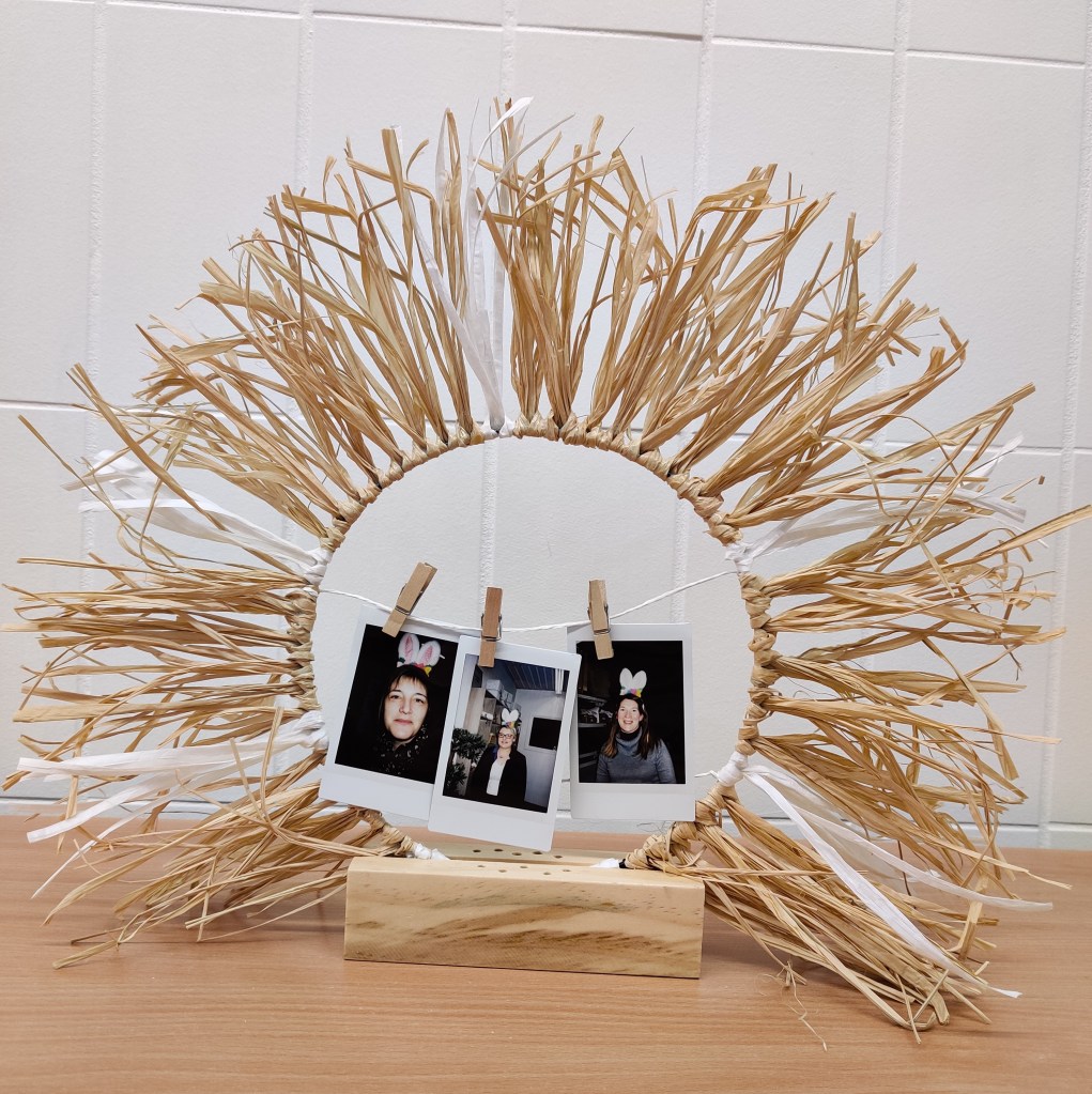 Nous avons eu envie de réaliser une couronne murale en raphia pour pouvoir ajouter des photos à l’intérieur
