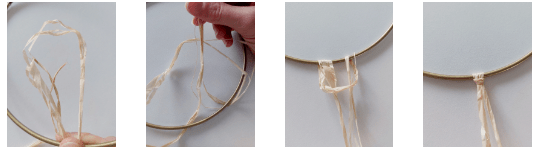 - Fixer les fils sur votre cercle à l’aide d’un nœud à tête d’alouette (c’est très simple à réaliser. Retrouvez les explications avec photos ci-dessous)