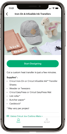 Choisissez une image, écrivez un texte ou créez un motif qui utilise les deux. Demandez à la Cricut Joy de découper ou de dessiner, puis suivez les instructions pour transférer votre motif sur votre support à personnaliser.