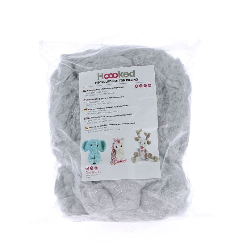 Chez DMC, la ouate de rembourrage est en coton recyclé: 100% de fibres recyclées (85 % coton et 15% d’autres fibres)