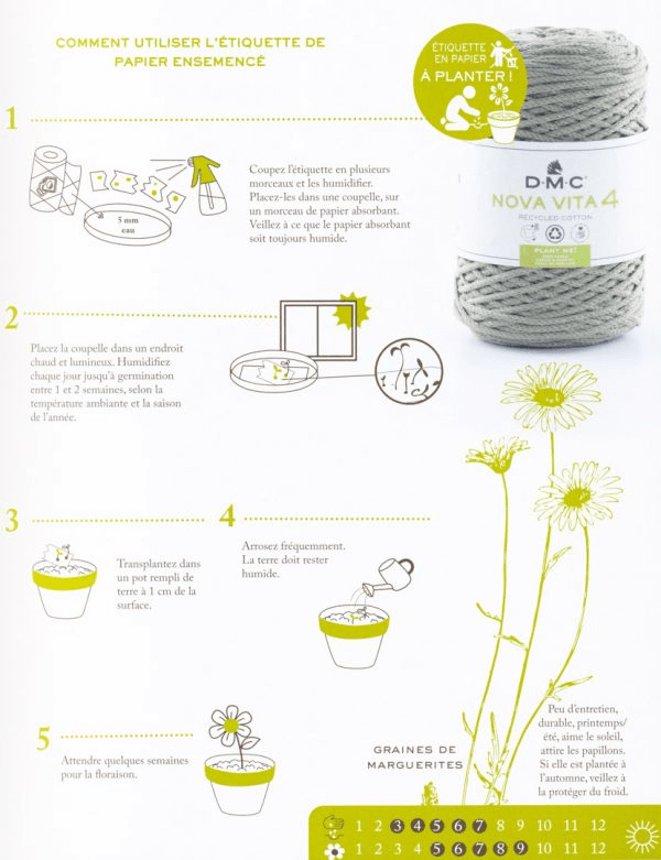 La gamme Nova Vita 4 en plus d’être un fil recyclé, dispose d’une étiquette constituée de graines: on plante l’étiquette et on récolte de magnifiques marguerites !