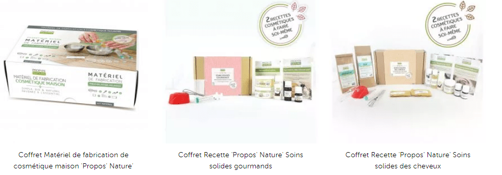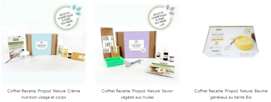 Vous pourrez retrouver sur notre site des coffrets tous prêt pour réaliser par exemple sa crème de jouvence à l’acide hyaluronique ou encore un baume généreux au karité bio!