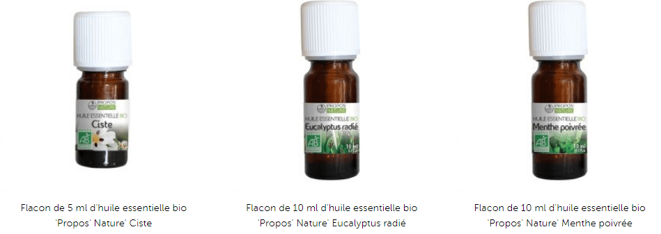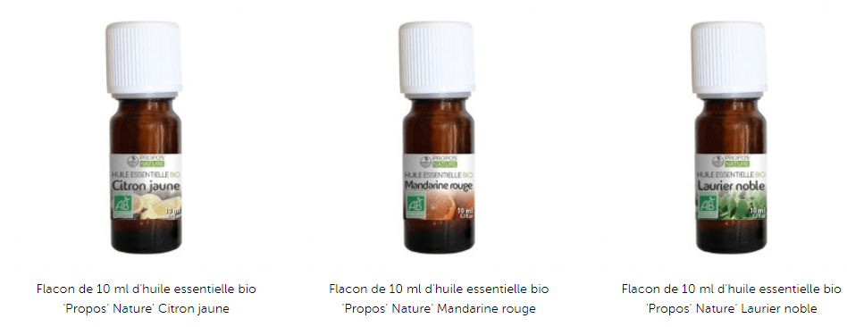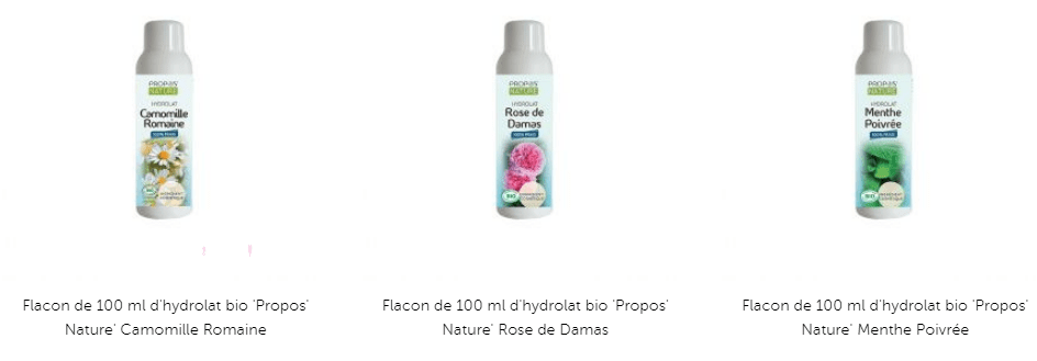 Nous avons également des flacons d’hydrolat bio, toujours de la marque Propos’ Nature. Un hydrolat est un produit aqueux de condensation obtenu après distillation d’une matière première naturelle, généralement végétale, qui subsiste après l’entraînement à la vapeur d’eau et la séparation de l’huile essentielle lorsque c’est possible.