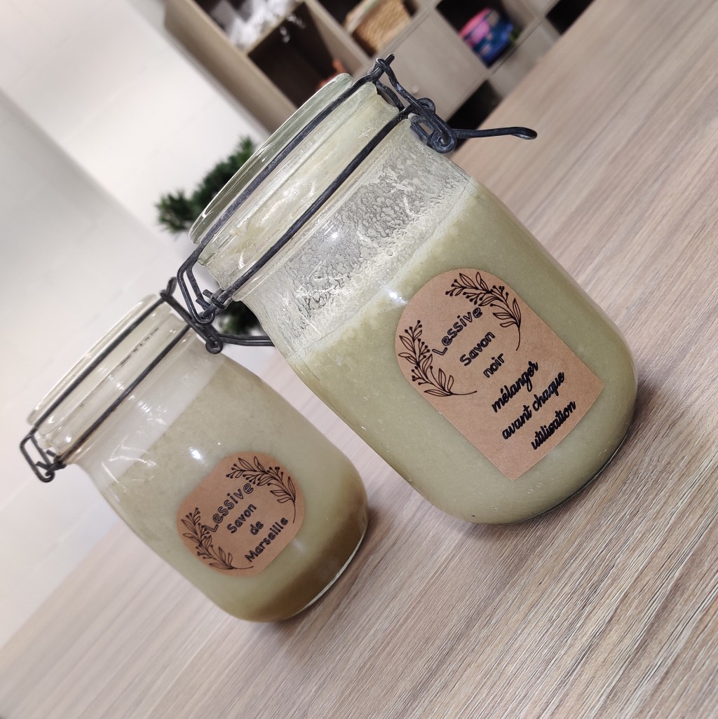 Autre argument de taille, la lessive maison est nettement plus économique que sa version achetée en grande surface. Et c’est aussi une économie de déchets puisqu’on réutilise le même contenant en verre à chaque réalisation.