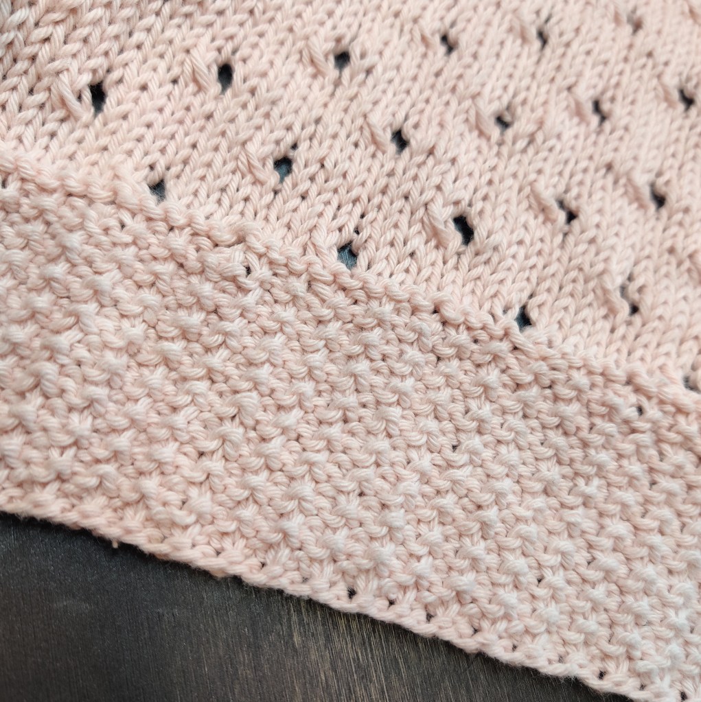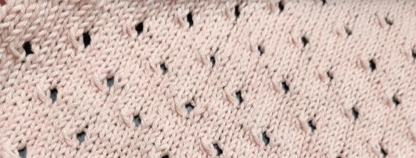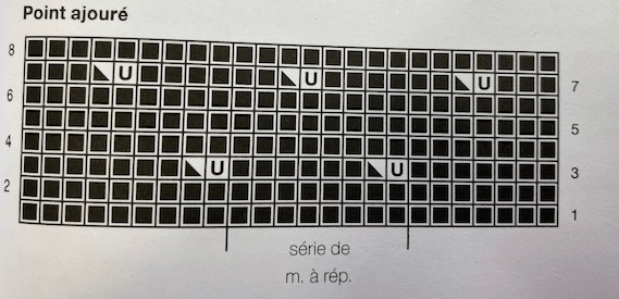 Veillez à ce qu’il n’y ait pas de jeté en début ou en fin de rang car chaque jeté doit être compensé par des mailles tricoté ensemble pour que le nombre de maille reste constant et que le point soit respecté. Il faut donc éventuellement tricoter 1 maille endroit en début ou en fin de rang à la place du jeté.