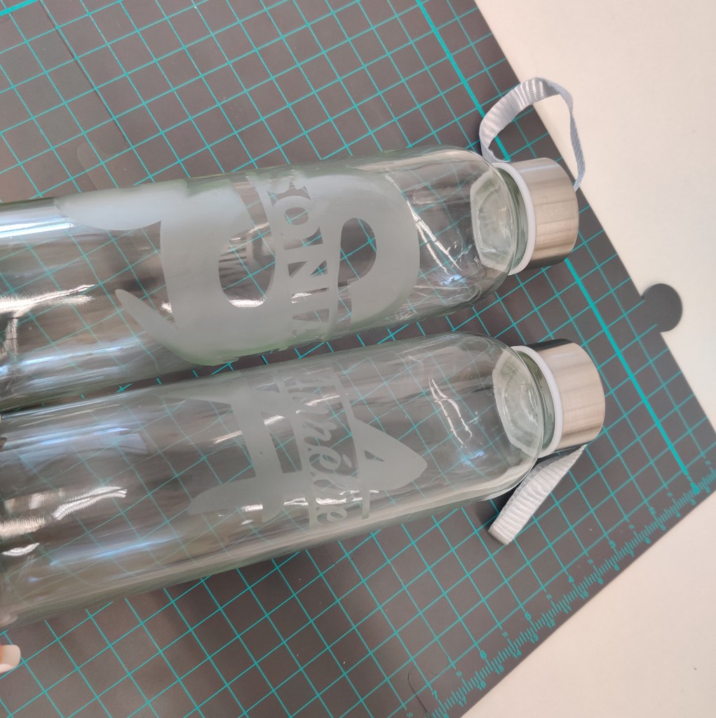 Ensuite, appliquez le film de transfert sur le vinyle pour déplacer la découpe vers la gourde en verre. Assurez-vous qu’il soit bien positionné et qu’il n’y ait pas de bulles d’air sous le pochoir.