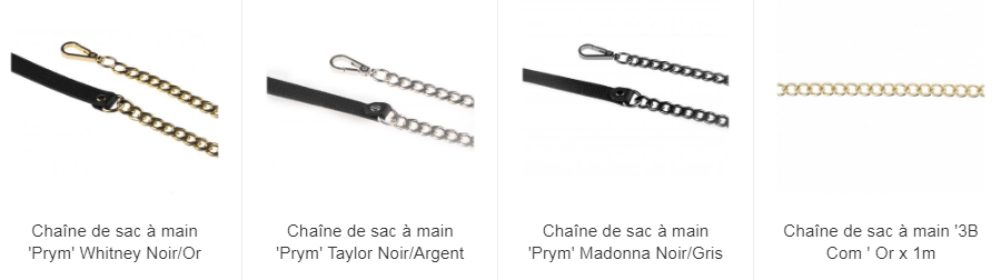 Pour apporter une touche sophistiquée ou originale à vos sacs, nous proposons également des chaînes métalliques en or, argent ou bronze. Elles peuvent être utilisées comme bandoulières ou comme éléments décoratifs, en combinaison avec vos anses ou sangles. Les chaînes ajoutent une touche élégante à vos créations, tout en offrant robustesse et longévité.