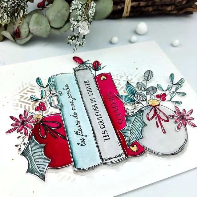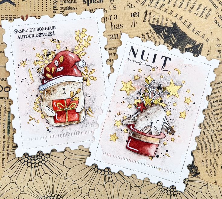 - Tampons clear ou bois : utilisez des tampons sur le thème de Noël avec des encres colorées ou métalliques pour des motifs nets et festifs.