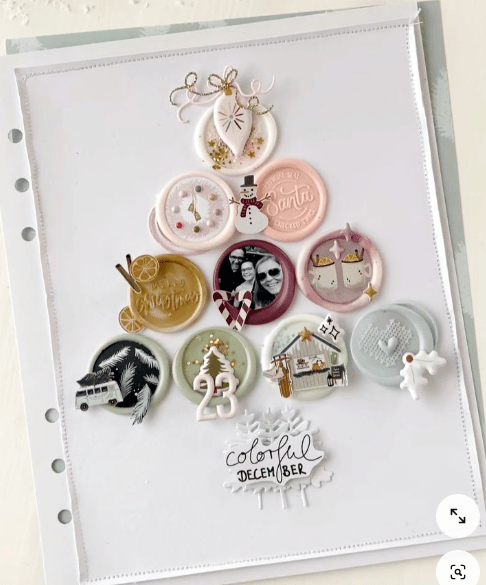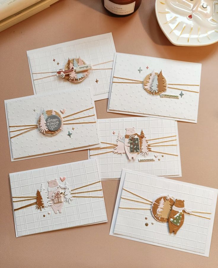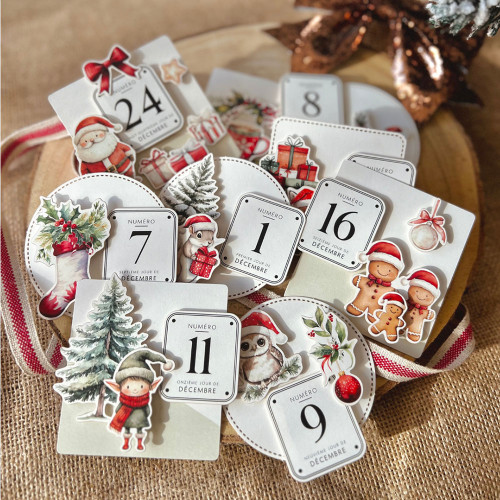 - Die-cuts et découpes : sapins, étoiles, flocons ou petits personnages comme des bonshommes de neige ou des lutins.