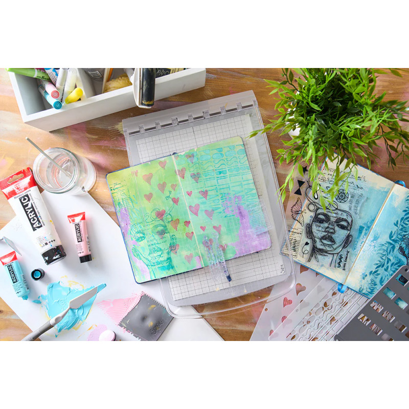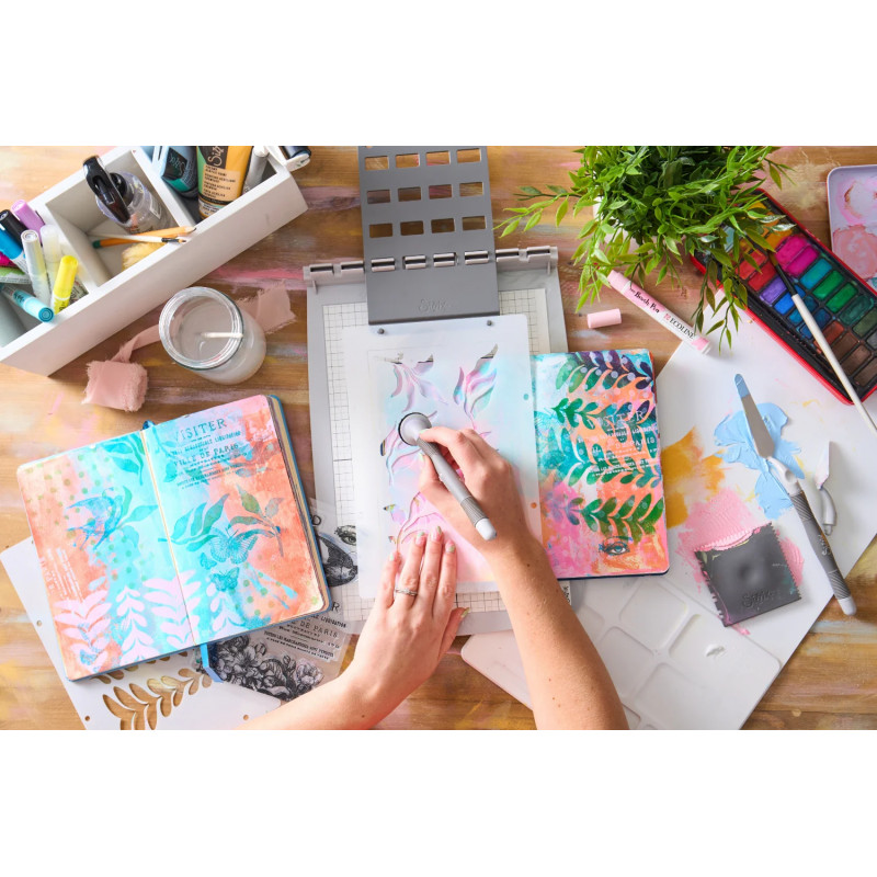 L’outil Press Tool ‘Sizzix – Studio’ est un accessoire ingénieux conçu pour faciliter l’application homogène et précise des tampons et pochoirs sur vos projets créatifs. Vous pouvez tamponné des papiers mais vous avez également la possibilité de mettre directement un carnet/journal sur la plaque ! Du jamais vu !