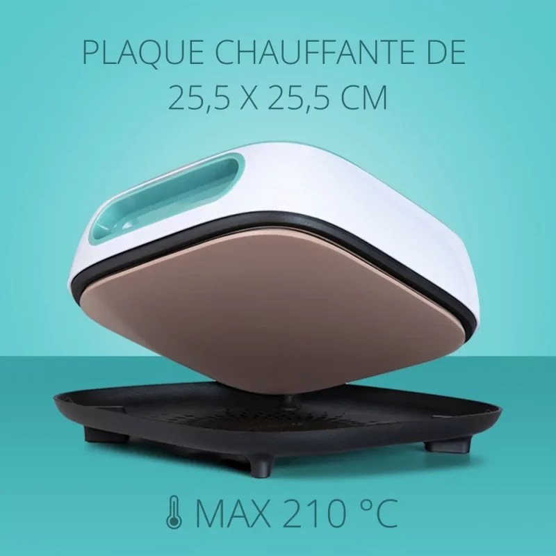 Dotée d’une plaque chauffante en céramique de 25,5 x 25,5 cm, la presse LOKLiK assure une diffusion homogène et rapide de la chaleur jusqu’à 210 °C.